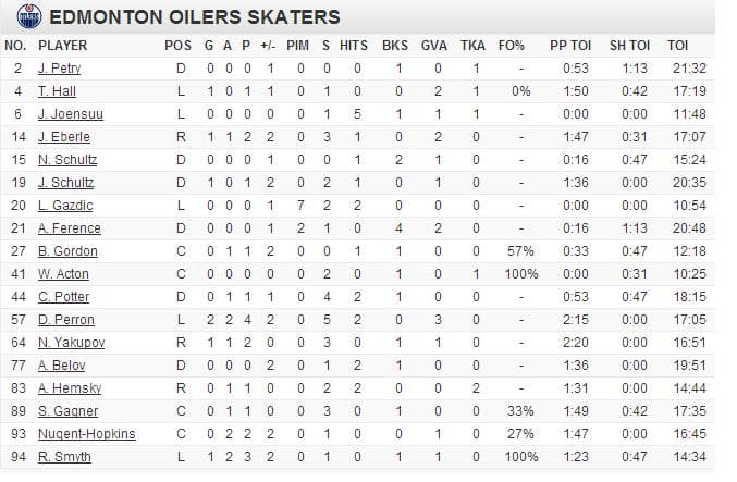 No fewer than 11 players had points for the Mighty Oilers tonite including Perron who led the way with 4. That’s unreal.