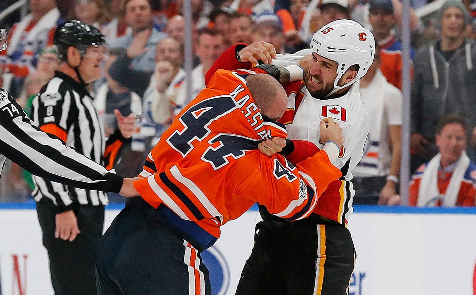 Oct 4, 2017; Edmonton, Alberta, CAN; Edmonton Oilers forward Zack Kassian (44) and Calgary Flames forward Tanner Glass (15) fight during the first period at Rogers Place. Mandatory Credit: Perry Nelson-USA TODAY Sports