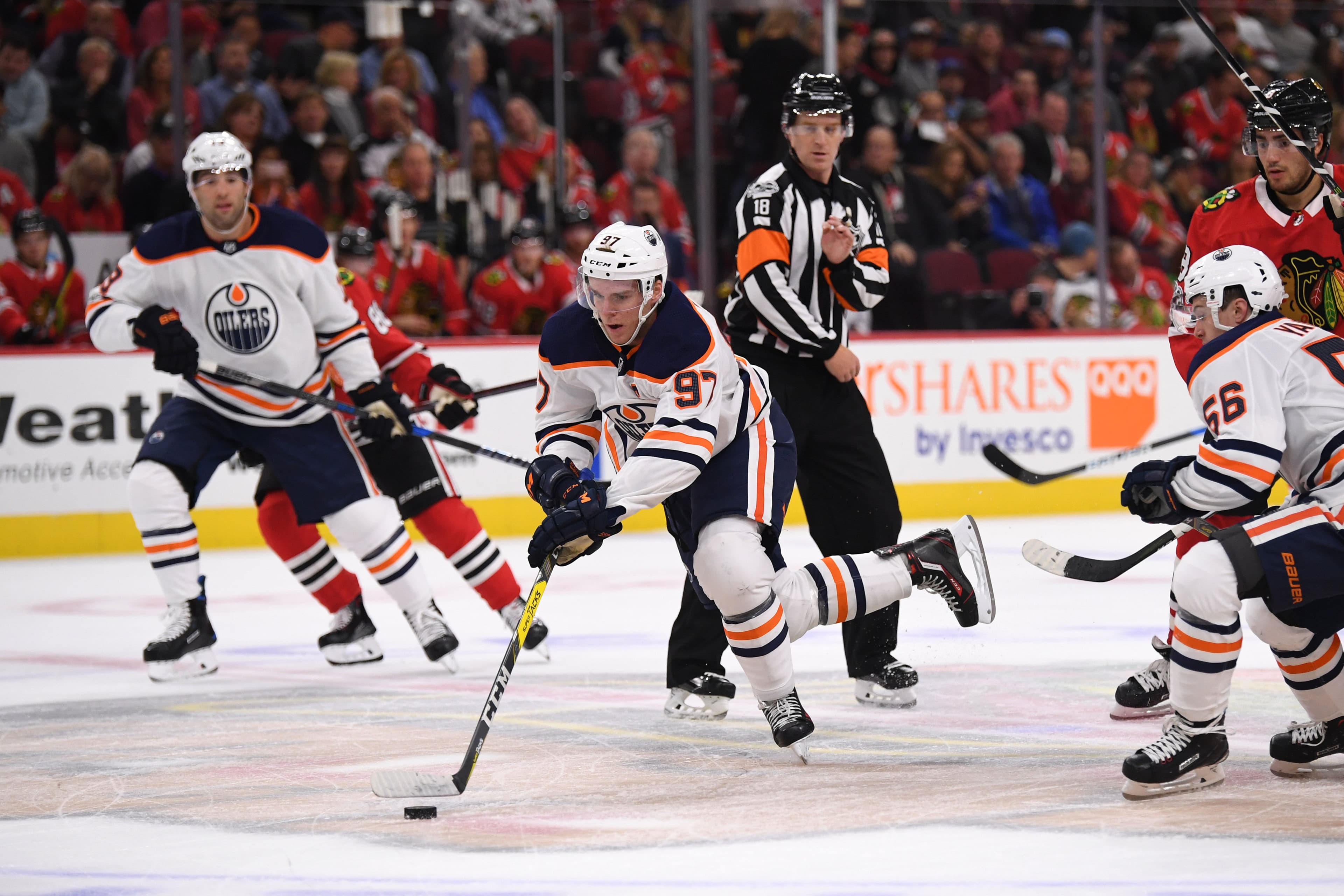 Oct 19, 2017; Chicago, IL, USA; Edmonton Oilers center Connor McDavid (97) skates with the puck against the Chicago Blackhawks during the first period at United Center. Mandatory Credit: Patrick Gorski-USA TODAY Sports