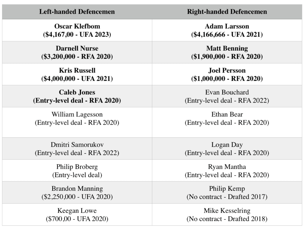 Larsson could certainly be signed to a new contract after his deal expires as he and Klefbom become the team’s veteran top-four pair. Benning is an under-the-radar depth defenceman who could stay or go depending on how the likes of Persson, Bouchard, and Bear perform. Russell will be in his mid-30s when his deal expires and likely won’t be back. He could be pushed off the roster as soon as 2020-21 if Jones and Lagesson play well.
