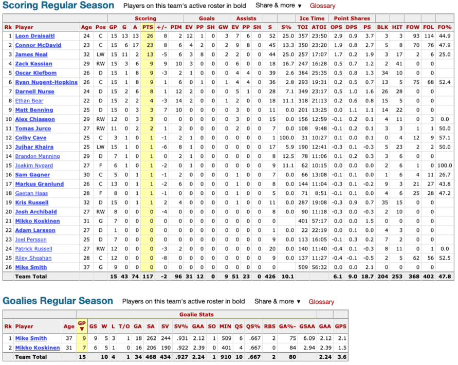 Edmonton’s goal rates and team shooting per centage have both dropped significantly, but that was to be expected. The numbers seen in the first seven games are absolutely unsustainable, and the team has regressed to the mean there.