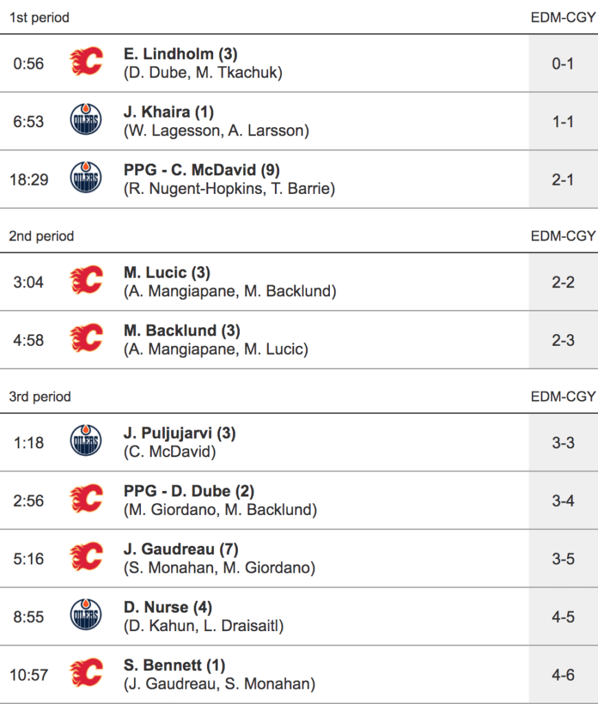 - @Connor McDavid gave the Oilers the lead (2-1) with a powerplay goal after taking a cross-ice pass from Nugent-Hopkins and ripping the puck high over Markstrom’s glove hand. All night long, McDavid was rushing the puck with all of the speed in the world and it was a handful for the Flames defenders to handle.