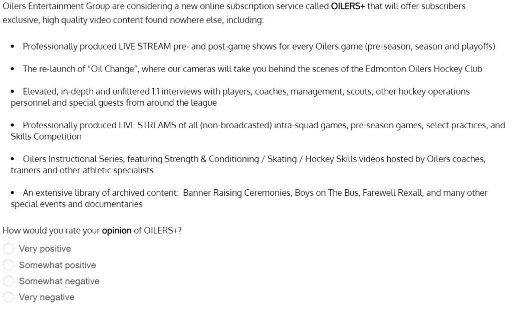 A survey advertisement has recently appeared on the team’s website, and involved a 29 question questionnaire asking for opinions on a proposed OILERS+ premium content services. No similar popups appeared on any of the NHL’s other team websites.