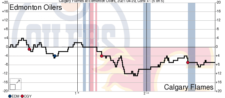 Credit to the Flames, they played like a team still desperately fighting for a playoff spot. They won races and puck battles, completely outplayed the Oilers in the second period, and then did a strong job at slamming the door in the third. You can see on the shot chart below when Edmonton’s fatigue set in and when the Flames started to tilt the ice.
