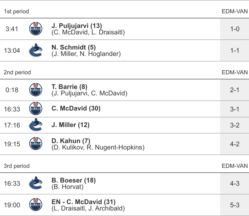 - Only 41 seconds after McDavid made it a two-goal game, JT Miller pulled the Canucks back to within one after he carved his way through traffic, pulled off a nice little dangle to the backhand, and roofed the puck up over Koskinen.