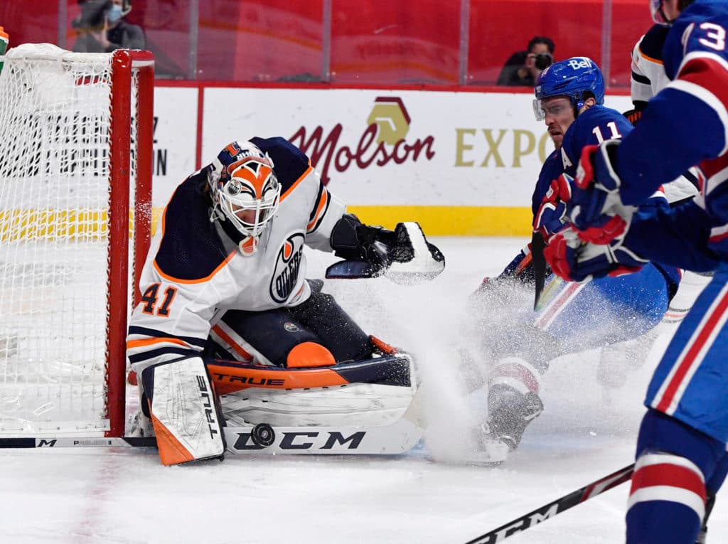 Feb 11, 2021; Montreal, Quebec, CAN; Montreal Canadiens forward Brendan Gallagher (11) looks for a rebound after Edmonton Oilers goalie Mike Smith (41) makes a save during the second period at the Bell Centre.