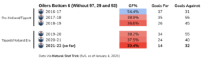 After all, the team without McDavid, Draisaitl, and RNH is at an all-time low in terms of 5v5 goal differential, worse than they were under Peter Chiarelli and Todd McLellan (!).