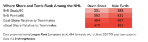 Here’s a visual displaying where Shore and Turris rank among the league statistically.