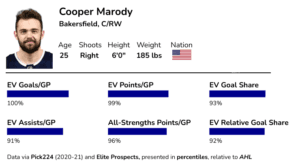 Pick224, an excellent site for prospect stats, hasn’t updated their website for the 21-22 season thus far, but here’s how Marody looked the prior season.