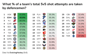 Over 40 percent of Edmonton’s shot attempts have been taken solely by their defencemen, ranking 2nd in the entire league in this regard. This is a staggering amount.