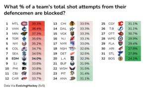 In addition, a relatively high rate of Edmonton’s shots from their defencemen are getting blocked. Only 25.1% of their unblocked shot attempts are missing the net (for comparison, the league average is 28.1%), but it isn’t encouraging that a (relatively) considerable portion of these shot attempts are getting blocked.