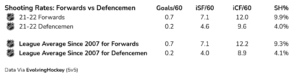 Historically, it isn’t astonishing that forwards are far superior finishers than defencemen. The average 5v5 SH% for forwards is over two times higher than the average 5v5 SH% for defencemen. Their rate of goals is roughly 3.5 times higher.
