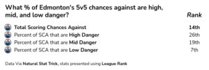 In regards to the total sum of scoring chances allowed, the Oilers are generally average, ranking 15th in the league. However, over 22% of the chances they allow are high-danger, and they rank 26th in the league in this facet. They’re also below-average in preventing mid-danger chances, but typically excel in suppressing low-quality shots against.