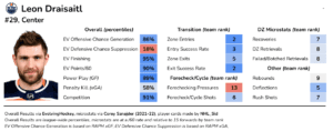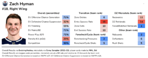 Injuries and COVID have definitely impacted his play. Regardless, Hyman’s performance when healthy has generally been solid. Hyman is typically a strong forechecker, and remains one of Edmonton’s only players who consistently crashes the net looking for rebounds and second chances.