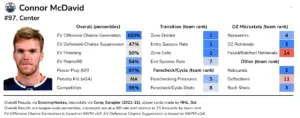 He’s producing at a 117 point pace with decent defensive metrics, and he still remains as the league’s best transitional player. His 5v5 xGF% is at a career-high, as McDavid is also generating scoring chances at a tremendously high rate.