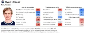 McLeod has been Edmonton’s best defensive forward, as his scoring chance suppression rate ranks in the 99th percentile among the league. His high rate of defensive recoveries/retrievals have likely played a large role in this.