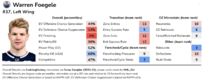 Foegele can occasionally be an aggressive forechecker, and he’s one of Edmonton’s best forwards in obtaining rebounds. However, Foegele has been Edmonton’s worst finisher, and his defensive metrics are quite poor. His play-making and offensive play-driving have been below-average as well.