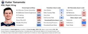 When it comes to playing style, what caused Yamamoto to be so effective in his 19-20 stint was how he excelled at playing a tenacious, aggressive playing style while constantly pressuring defenders. However, his forechecking microstats have declined ever since, and that likely plays a role in his poor offensive play-driving totals.