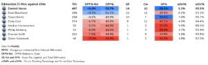 The other improvement is his performance against top competition. Here’s how every Edmonton defenceman plays against “elites,” or in other words, top lines and top defence pairs.