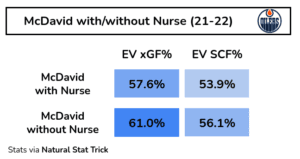 Of course, they still perform fine together, but to see a decrease in McDavid’s play with Nurse is certainly a concern in my eyes.