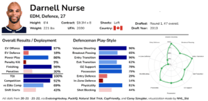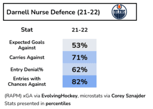 I’ve watched the entirety of Nurse’s career in Edmonton, and I’ve felt that his biggest flaw is his overall decision-making in his own zone. He often appears disoriented in the DZ, frequently gets lost in coverage, and is prone to making simple errors. Courtesy of Bryce Chevallier and InStatHockey’s metrics (a private analytics company), Nurse ranked 20th among 24 Edmonton skaters in overall Defensive Awareness in 20-21. My In-Zone Defence metric seems to agree with this. Not good.