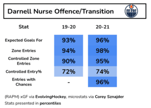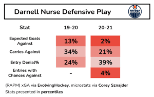 In 19-20, Nurse’s In-Zone Defence score ranked in the 24th percentile. In 20-21, it ranked in the 5th percentile. This metric doesn’t account for the quality of competition, but even relative to other top-pairing defenceman, this is an exceedingly poor sign.