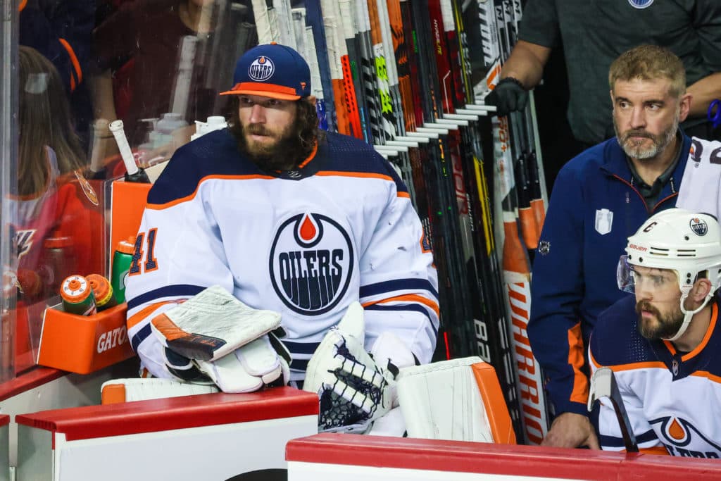 May 18, 2022; Calgary, Alberta, CAN; Edmonton Oilers goaltender Mike Smith (41) on his bench as he was replaced by goaltender Mikko Koskinen (19) during the first period against the Calgary Flames in game one of the second round of the 2022 Stanley Cup Playoffs at Scotiabank Saddledome.