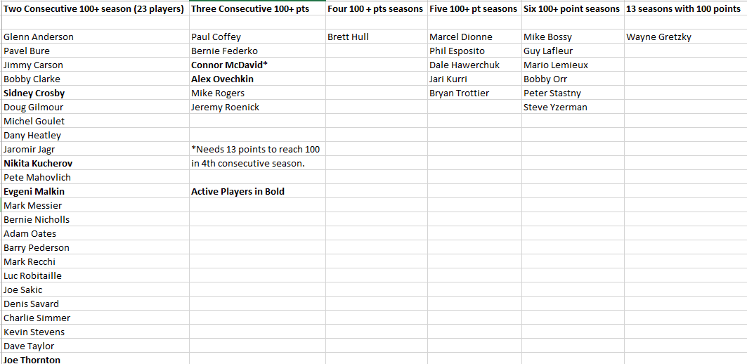 10. If you noticed, McDavid is 13 points from becoming the 14th player to have four consecutive 100+ seasons. If he stays healthy he has a pretty good chance to join @Wayne Gretzky as the only players to reach 100 points in seven straight seasons. Gretzky did it 13 in a row. Incredible.