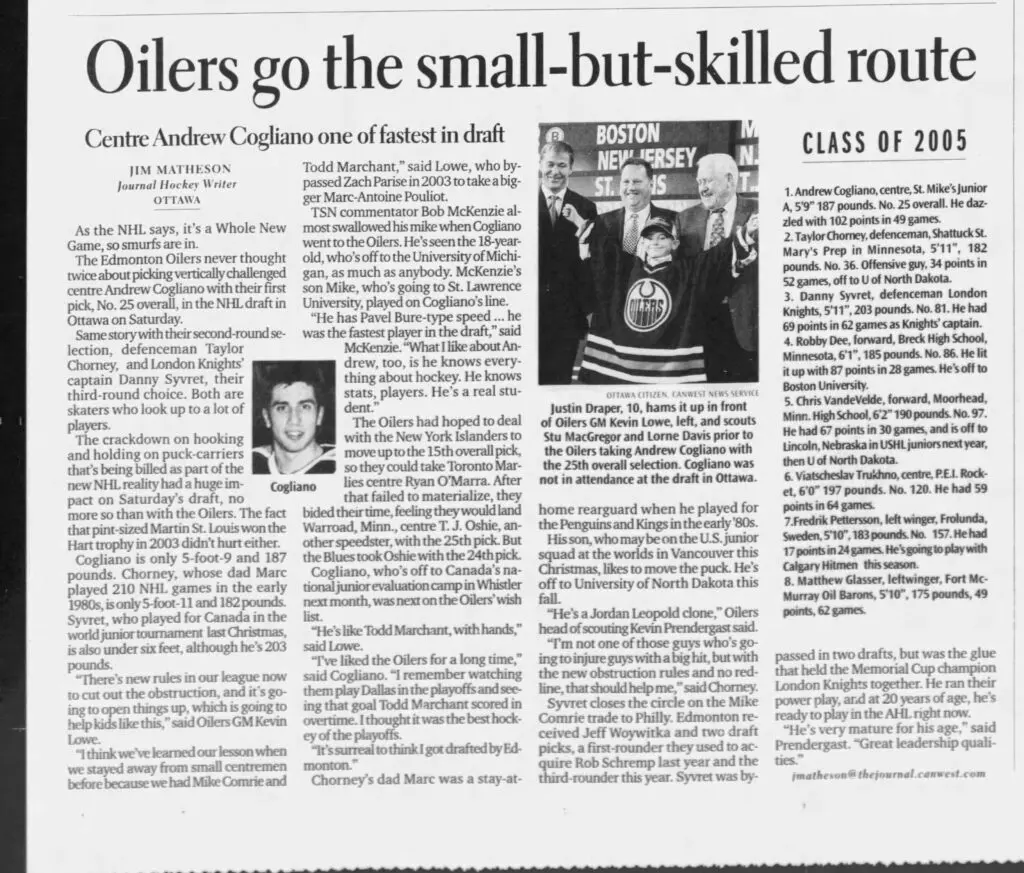 Edmonton’s first draft pick after the lockout reflected the NHL’s change in style. They selected Andrew Cogliano from the Ontario Junior Hockey League, a 5-foot-9 forward who was among the fastest skaters in the draft class.