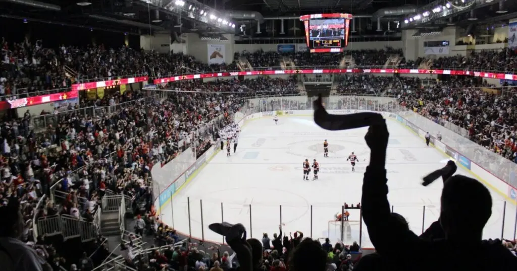 Fans watching an ECHL Indy Fuel game in Fishers, Indiana.
