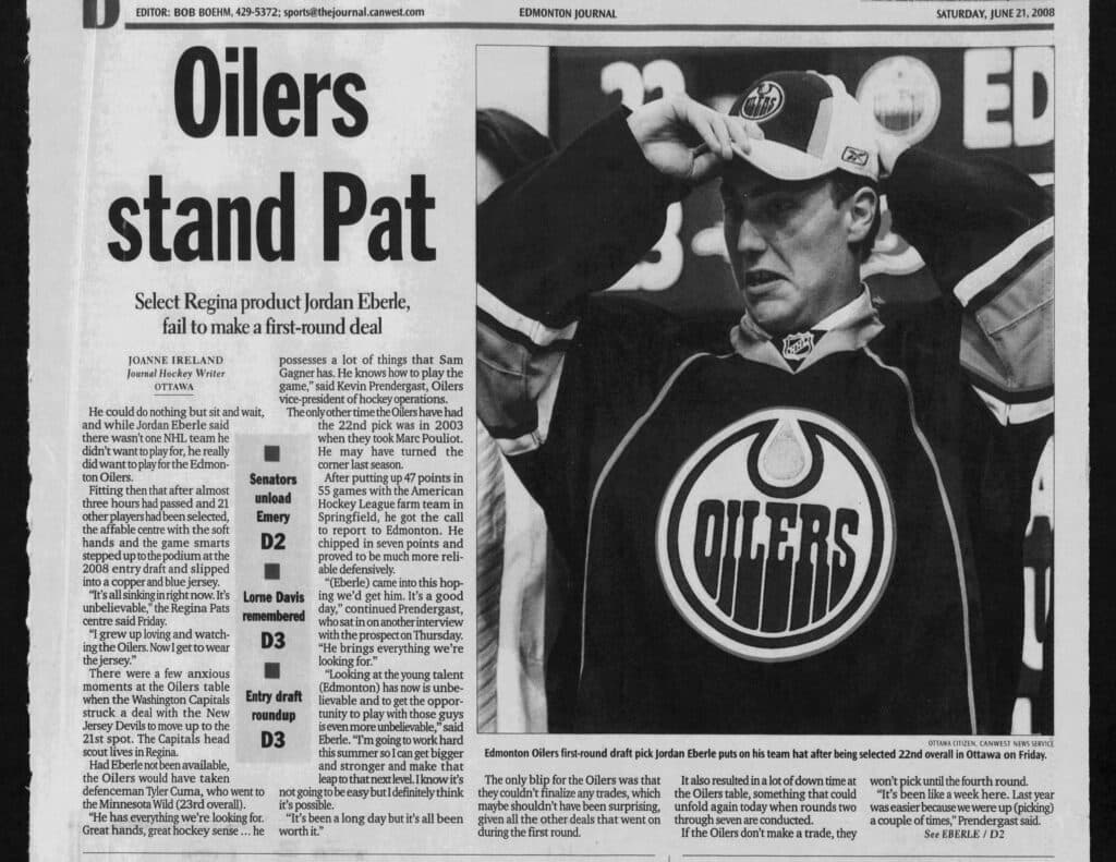 The Oilers selected Eberle with the 22nd overall selection in the 2008 draft, the pick they had received as compensation when the Anaheim Ducks won the Stanley Cup in 2007 after trading for Chris Pronger.