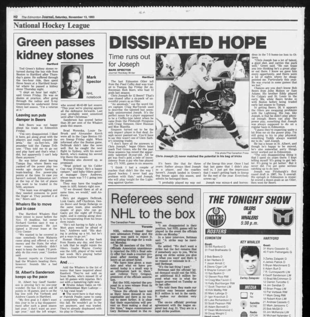 Joseph was one of the players the Oilers got in return when they traded Paul Coffey to the Pittsburgh Penguins in November of 1987. The Penguins had selected Joseph with the fifth overall pick in the previous summer’s draft and played 24 games in the NHL as an 18-year-old between the two teams. Over parts of seven seasons in Edmonton, Joseph mostly bounced up and down from the minors, scoring 51 points over 154 games between 1987-88 and 1993-94.