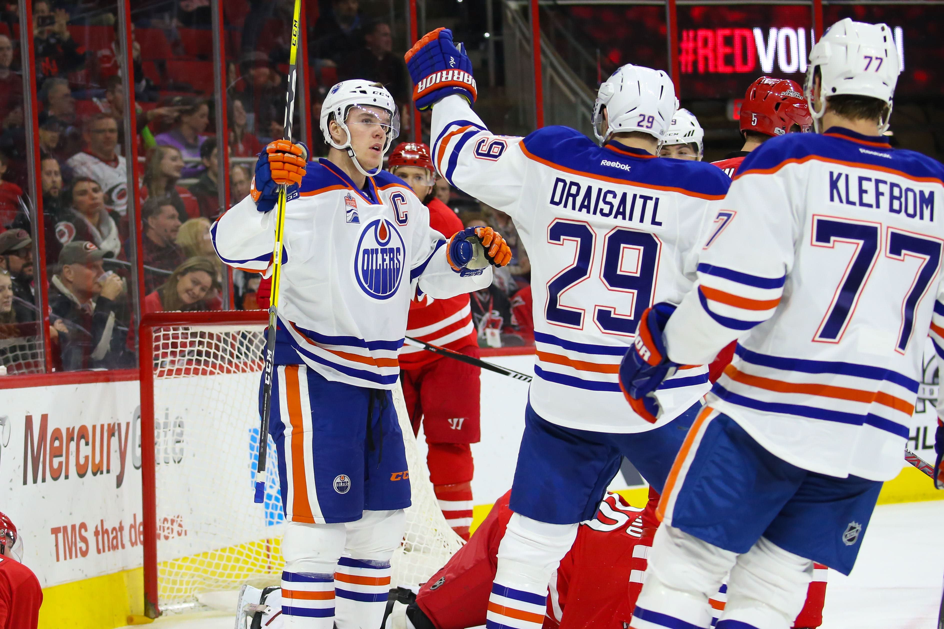 Feb 3, 2017; Raleigh, NC, USA; Edmonton Oilers forward Connor McDavid (97) celebrates his second period goal against the Carolina Hurricanes at PNC Arena. the Carolina Hurricanes defeated the Edmonton Oilers 2-1. Mandatory Credit: James Guillory-USA TODAY Sports