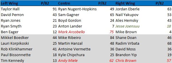 There isn’t much to choose from on the fourth line – Chipchura seems a better bet for 2013-14 than Lander, but Smyth/Joenssu/Brown looks better to me than Yip/Kennedy/ Bissonnette.