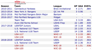 “Teams seem to favor taking goalies in the 3rd round or later, but Knight is one of the most advanced North American-trained backstops to come around in quite some time. Some feel that he’d be a top-five pick if the league reverted to the old trend of taking netminders that high… the reduction in equipment size doesn’t seem to impact Knight, who covers his gaps quickly thanks to exceptional anticipation and forcing shooters out of their comfort zones.” -Steve Kounianous, The Draft Analyst“… One of the best athletes in the draft class, he already displays quick movement, good puck tracking, and high end read and reactions for a young goaltender. His on and off the ice demeanor and maturity only strengthens one’s evaluation of his size and athleticism and success as a top junior goalie. Still working to improve his game and further economize his movements, the future looks bright enough for him to be the 10th United States-born goaltender selected in the first round. He is committed to Boston College, where he will further build his game.” -Bill Placzek, draftsite.com“Knight has continued to be the backbone for The Program. He’s been nearly unbeatable against USHL competition, but it’s his performances against NCAA Division I schools and on the international scene are what have really stood out. His .916 save percentage in 20 USNTDP contests rivals some of the best season-long performance in the history of The Program. He appears to be a lock for the first-round this June with an eye towards being the first goaltender selected in the top-15 since Jack Campbell in 2010.” Cam Robinson, dobberprospects.com
