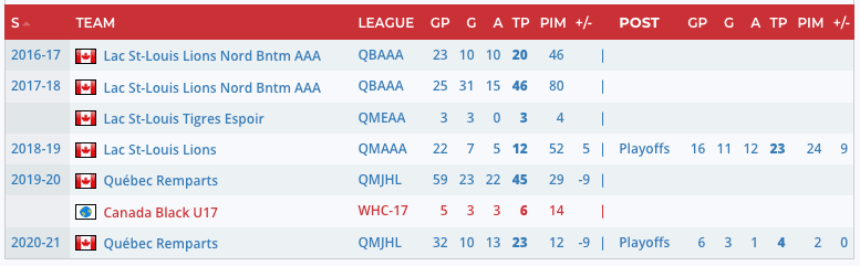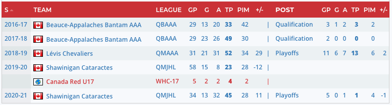 “Nadeau is a right shot forward who lined up all night on the left side, on a line that featured fellow 2021 draft prospect Xavier Bourgault and 2020 Dallas Stars first rounder Mavrik Bourque. On this night, the threesome had their fingerprints all over the scoresheet with Nadeau leading the way with three goals and one assist, and was named the game’s first star. Nadeau did a lot of things well, but his contributions in the offensive zone as a shooter really stood out. He was able to play in traffic and when he found soft spots in Chicoutimi’s defensive coverage his shot accuracy and quick release were on full display. With his size and skillset Nadeau can capitalize on scoring chances in multiple ways and on this night his willingness to drive to the net paid off in his third goal when he moved through the slot and from in-tight tucked the puck under the bar. There was also some indication of Nadeau’s physical game tonight. While dumping a puck in from the neutral zone, Nadeau was vulnerable and took a big hit that seemed to rattle him slightly. This may not be the way most power forwards prefer to show their willingness to be involved in the more punishing elements of the game but Nadeau’s ability to get back up, shake off the hit and continue to be a physical presence in front of the net and along the boards certainly says something about his compete level.” – Shaun Richardson
