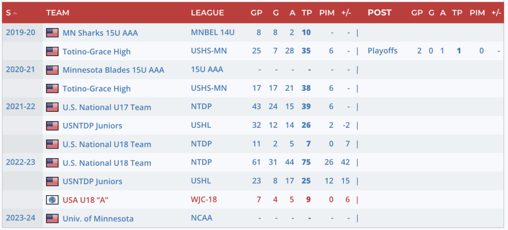 Scouting Report: “A point-per-game average as a freshman on one of the best teams in Hockey East is a solid way to kick off your college career. All he has done at every level is produce points and excel on the power play. His chemistry with top 2024 prospect Macklin Celebrini is a big reason why Canada won bronze at the U-18s.” – Steven Ellis, Daily Faceoff
