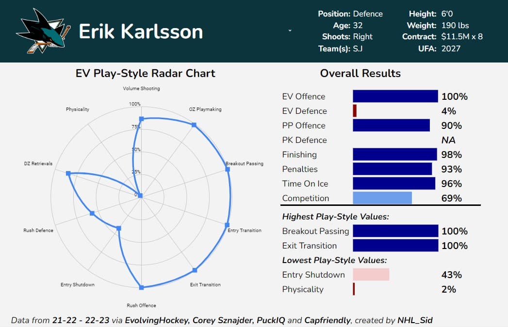 He remains very skilled offensively. His controlled zone entry and OZ shot assists metrics rank high on an awful team, but his defensive impact is abysmal. Sure, he could improve on a better team, but his defence was rapidly declining in Dallas for several years. Unless your name is Erik Karlsson, I don’t think this team needs another high-event defender.