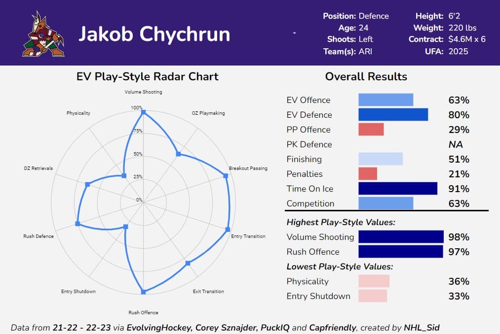 Defenders that can consistently play against top opposition and post strong results at both ends of the ice aren’t that common on the trade market, and Chychrun fits these criteria while playing on an awful Arizona team. Players of that calibre at a young age and with an excellent contract aren’t often available.