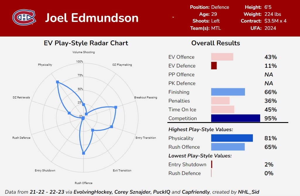 For most of his career, Edmundson has been one of the worst defencemen in the league at breakouts, which certainly wouldn’t help a team that already struggles with this facet. He doesn’t exit the zone with control at a high volume, and he’s very prone to turning the puck over or icing it as he tries to exit the zone. Edmundson is substandard at retrieving pucks in the DZ as well, and he’s been burned off the rush at an exceedingly high rate this season.