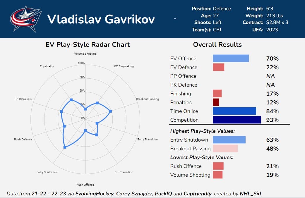 Gavrikov posted strong underlying results in 19-20 and 20-21 in a lesser role, but as his deployment increased, he struggled. Gavrikov has been fed exceedingly tough zone starts and deployment against top opposition, and his defensive numbers have tanked.