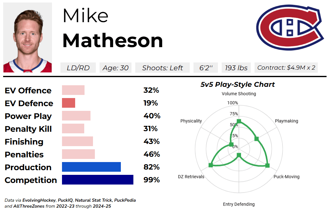 Matheson is a 30-year-old defenceman on the Montreal Canadiens, carrying a $4.9M cap hit for one more season after this one. With the Canadiens well out of a playoff spot, they are expected to be sellers at the deadline, and thus, Matheson could be available. He is primarily a left defenceman but has experience on the right side.