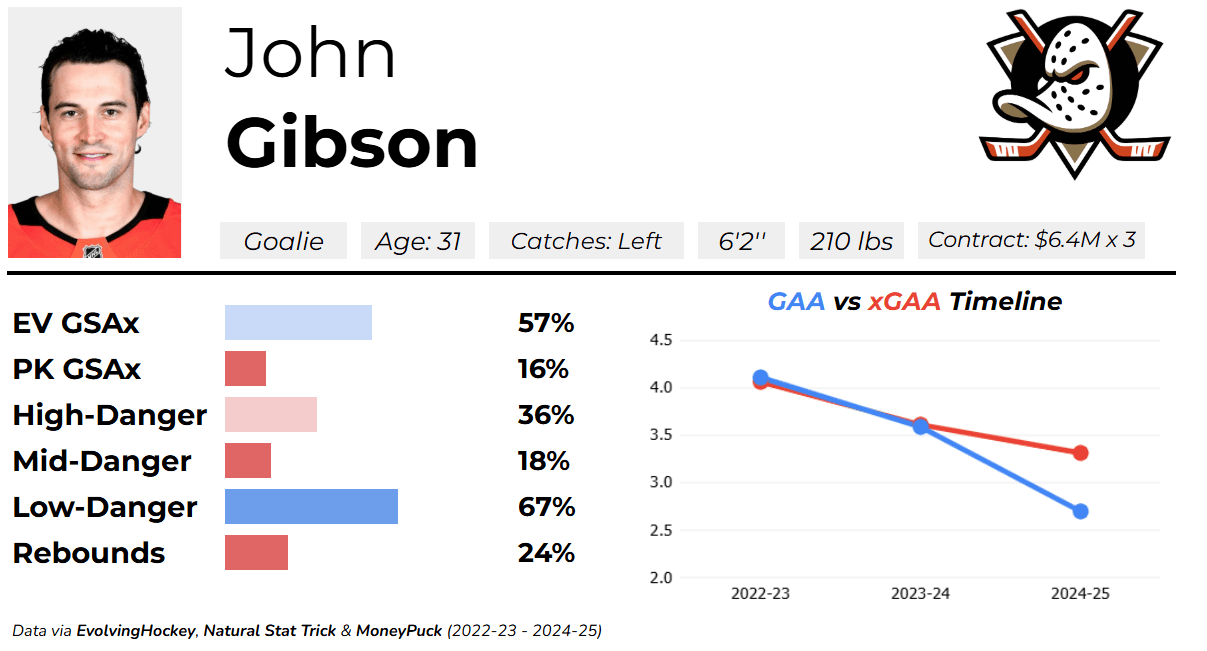 At the peak of his career, Gibson was objectively elite, arguably a top-three goalie in the league. But, that peak was well over half a decade ago, because from 2019-20 through 2022-23, Gibson produced a negative GSAx in each of those four seasons. In 2023-24, he managed a slight positive in GSAx, but nothing spectacular, and slightly worse than Pickard.