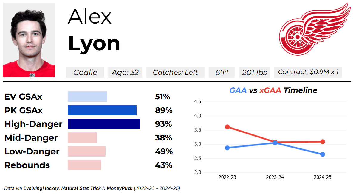 Alex Lyon is a 32-year-old goalie on the Detroit Red Wings, carrying a $900,000 cap hit for this season.