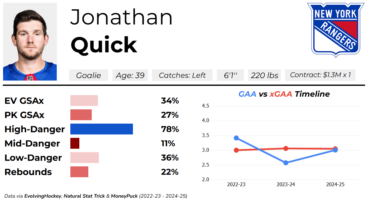Now, Quick’s raw results on the graphic above look subpar, but it’s primarily brought down by a terrible season in Los Angeles in 2022-23. With the Rangers, Quick has been a fantastic backup and has been amongst the best goalies in the league at stopping high-danger chances.