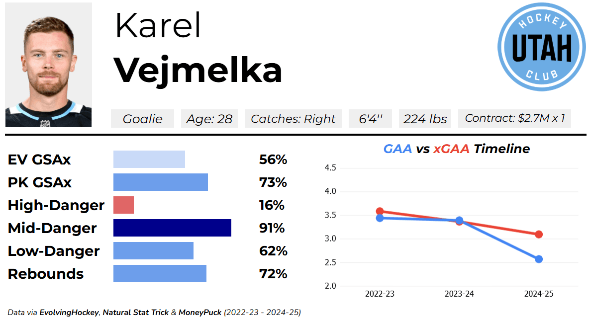 Karel Vejmelka is a 28-year-old goalie for the Utah Hockey Club. He’s an expiring UFA this summer, currently carrying a $2.7M cap hit.