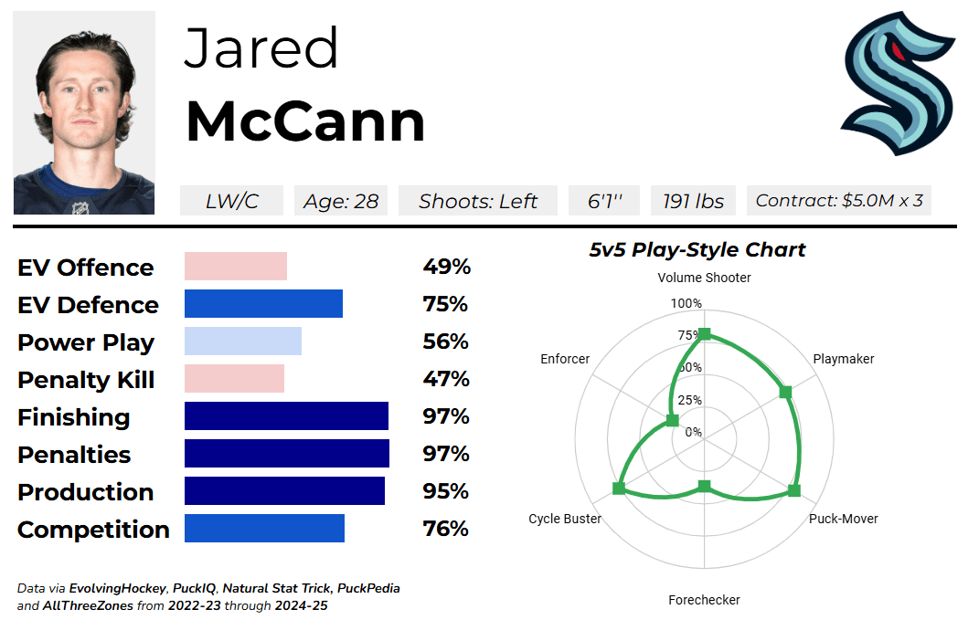 Jared McCann is a 28-year-old forward on the Seattle Kraken with a $5M cap hit for the next three seasons. Per Sportsnet’s Jacob Stoller, McCann could be made available prior to the deadline.