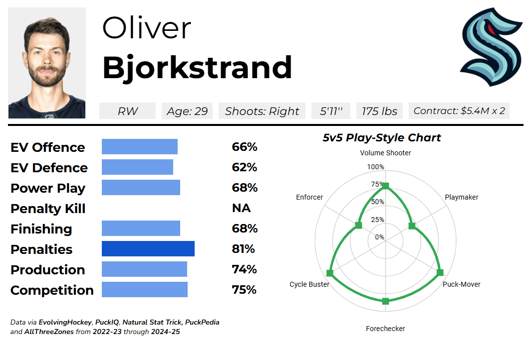 Bjorkstrand may not be elite in any specific facet, but he provides value in a variety of different areas, whether it’s scoring goals, forechecking, breaking up plays in the defensive zone, and more. He currently leads the Kraken with a 56 percent goal differential at 5-on-5.