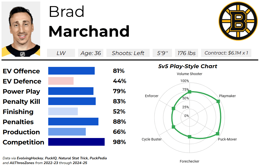 Brad Marchand is a 36-year-old winger on the Boston Bruins. He’s an expiring UFA this summer, currently carrying a $6.1M cap-hit this season.