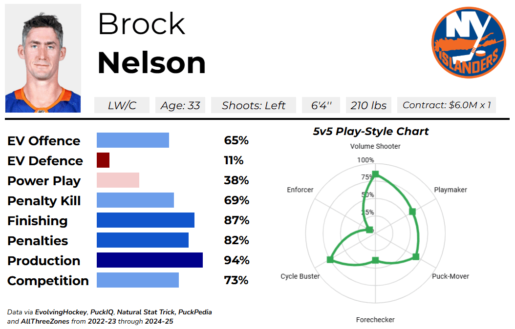 Now, Nelson’s defensive results are a mixed bag. On the one hand, Nelson is a strong in-zone defender, very involved in his own zone at retrieving loose pucks and breaking up cycles, and for this reason, he’s an effective penalty-killer. However, his overall 5-on-5 defensive results are rather awful, largely because he tends to play a high-paced, high-event game that leads to a large number of rush scoring chances both ways. Perhaps he only plays this style of game to compensate for NYI’s lack of offence, and so I would expect him to improve in that facet in Edmonton, but the fact that these results have persisted for his entire career is something to at least keep note of.
